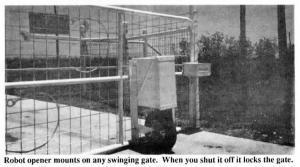 The remote-controlled opener consists of a waterproof metal box that houses the electric opener, and a chain-driven rubber wheel. The unit simply bolts into place and is connected up to 110-volt AC power. Asay says you can run a wire from up to 300 ft. away without using any kind of power booster. It'll handle gates from 15 up to 450 lbs. When the unit :s shut off the wheel locks into position.