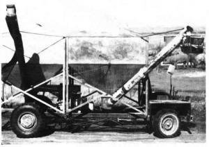 "The tank", as Rodocker calls it, is powered by a 16 hp Briggs & Stratton engine salvaged from a riding lawn mower. It's equipped with two tanks salvaged from an old grain vacuum rig that each hold 100 bu. of feed. Rodocker sits in front and uses a directional lever to steer the rig along a fenceline. A dump scale bolted to the output end of the front tank's unload auger lets him dump measured amounts of feed on-the-go over a fenceline onto the cement floor of each sow pen. An 8-ft. long canvas "sock" mounted on the end of the rear tank's auger is used to drop feed into feeders for small pigs. The rig travels at up to 4 mph.