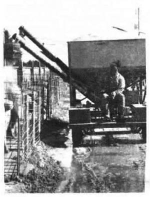 "I had been bucket feeding from a pickup, but it took too much time. I can feed 160 sows in about five minutes compared to 1 1/2 hours when I was bucket feeding and I had to grind a new load of feed twice a day. Each tank on my home-built feeder wagon holds two tons of feed so I can grind feed less often." The feed wagon has three levers. The hydraulic steering lever works like an airplane steering stick. Rodocker pushes it left to turn left and right to turn right. Another lever controls forwardand re-verse direction. The third lever controls the augers. A dual hydraulic pump runs off the engine with one pump powering and steering the rig and the other pump running a pair of hydraulic motors that power the augers on each tank. A foot pedal lets Rodocker speed up or slow down. To steer the rig he connected a hydraulic valve to a two-way hydraulic cylinder mounted on front axle's tie rod.