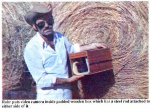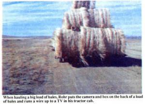 "Whenever I hauled a big load of bales down the road I had to have someone ahead of me to let me know if there was a car behind. This video lookout system lets me see for myself," says Lonie Rohr, Glad-stone, N. Dak. He mounts a video camera on the back of the load and runs a cable up to a TV mounted in his tractor cab.