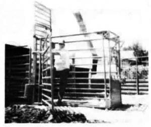 Invented One Man Cattle Chute That You Can Move With A 3-Pt. Hitch LIVESTOCK Handling 15-1-34 I invented this one-man cattle chute that you can move with a 3-pt. hitch. The back end has a tailgate with a counterbalance on it for raising and lowering. When a steer's neck touches the headgate, it automatically drops down, locking in place. When you are done with the animal, you can open the side gate to turn it out. The chute has a wood floor so that the weight of the animal holds it in place. (Larry L. Cox, Rt. 1, Swan, Iowa 50252)