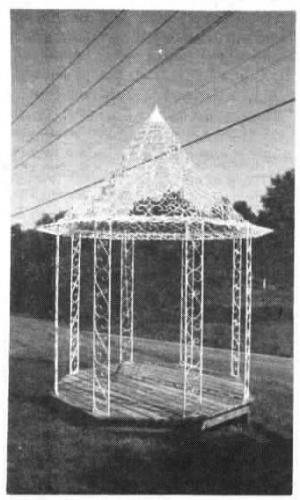 I am a retired machinist and general fore-man of the National Park Service's metal crafts shop in Washington, D.C., and I build and sell these octagonal wrought iron gazebos. They're made by cold-forming the scrolls using a bender and jigs and then welding them together into assemblies. The assemblies are then bolted together. I helped design and then built the iron gazebo used for Tricia Nixon's White House wedding in 1971 and other examples of my metal work can be seen around the White House. The overall height of the gazebo is 12 ft., 6 in. and it's 10 ft. wide at the roof. The side columns are 7 ft., 1 /2 in. tall. There are a total of 672 scrolls in the gazebo. All scrolls are 3/16-in. thick with rounded ends. (William W. Cranford, Rt. 2, Box 35, Indian Head, Maryland 20640 ph 301 743-7718)