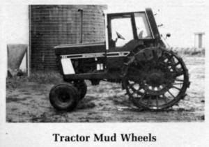 "They'll pull a corn chopper through more mud than a big 4-WD," says Bruce Rootkie, Brook Park, Minn., about the home-built mud wheels he made from scratch and mounted on his IH 986 tractor.