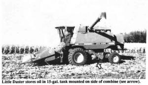 The Little Duster I stores soybean oil in a 15-gal. tank mounted on the side of the combine. A small hole is drilled into the discharge auger and the nozzle is seated into the hole. A 12-volt pump circulates oil to the nozzle and onto the grain. The pump is activated by a switch inside the cab, and a pressure gauge lets you control application rate. The system works equally well on corn, soybeans, and small grains.