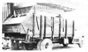 Made A Chicken Manure Spreader Out Of A Grove 16 ft Ensilage Box MANURE HANDLING Equipment 15-1-35 I made a chicken manure spreader out of a Grove 16-ft. ensilage box mounted on a truck. The box is turned backward and the feed apron on back of the rig is removed. In place of the apron, I mounted a metal plate 1/4 in. by 22 in. by 7 ft. on which I installed four hydraulic motors, each fitted with four 21-in. paddles that spread manure out behind the truck. The motors are run with a tandem pump connected to the truck power take off. The bottom beater on the box is the only one still used. The truck holds around 5 tons. Note in the foreground my "road ready" field roller fitted with truck treads that was featured in FARM SHOW's Vol. 14, No. 6 issue. (Ruben L. Atwood, Rt. 1, Box 361, Rileyville, Va. 22650)-