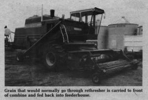 To install, on Massey combines,you simply remove the rethresher and extend the auger and flighting. A 7-in. dia. auger is then installed alongside the combine and dropped into a cross auger that empties grain into a 4 by 17-in. hole cut in the top of the feeder house. The return auger powers the 7 in. drop auger while the cross auger is chain driven, or powered hydraulically.