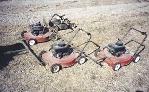Dyck removed the top half of the handles on the push mowers for better clearance under trees.