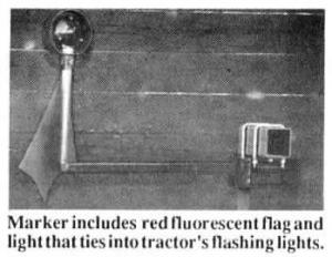 The markers, one on each side, consist of a red fluorescent flag and a 12-volt operated light which ties into the tractor's flashing lights. They mount on the rigid center sectionand you can adjust them to stick outpast the longest shank on fold-up wings. They're mounted on flexible brackets so they'll rebound if struck by a solid object and will fit most any cutivator, disk or other wide-wing implement.
