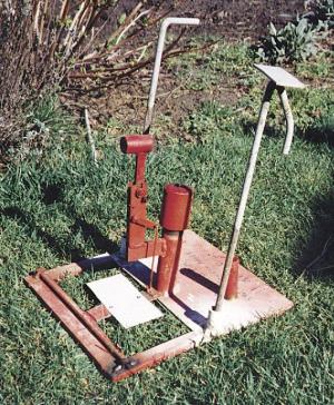 The Mount Vernon, Wash., retired farmer used an 8-in. length of Schedule 80 pipe for the "gun barrel", which mounts on an 18 in. sq. base built of 1/4-in. steel plate. A shotgun shell (any gauge) loads in a sleeve in the barrel, with a spring-loaded "firing pin" hammer resting above it. Two stabilizer rods atach to either side of the base to hold it in place when the gun recoils.