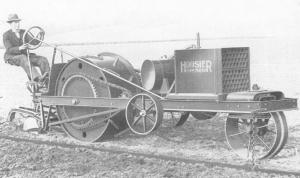 Road grading in the early part of the century was a labor intensive affair as this photo shows. Two men rode on the grader and one drove the Sandusky tractor, built by Dauch Manufacturing in Sandusky, Ohio. The blades on this big rig could apparently be set any number of ways, controlled by the four control wheels.