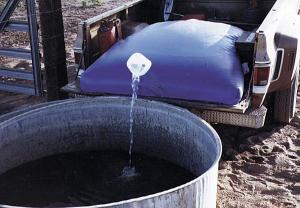 We needed a way to get water to horses out on pasture. I got the idea of using an old water bed mattress. I called the waterbed company to find out if anything toxic would be left inside the bed after using their anti-algae water conditioner. They said no. So I put the queen-size mattress into the bed of our pickup and filled it up. It looked like a huge rectangular blue balloon in the back of the pickup. The water bed nearly filled the 300-gal. stock tank.