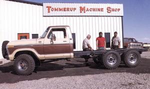 Hampton cut off the pickup frame about 3 ft. behind the cab. He then welded on a 12-ft. long frame he took from an early 1970s crew cab pickup. He fitted the new frame with the original rear axle and the rear axle off a 1973 Ford 3/4-ton 4-WD pickup. He also mounted an extra transfer case 2 1/2 ft. be-hind the cab, positioned so it faces backward. A pair of driveshafts on the transfer case are used to power the mid and rear axles, with one driveshaft going to each axle. A carrier bearing mounted next to the differential on the mid axle supports a single driveshaft that powers the rear axle.