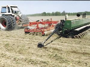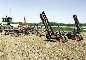 Drill Cultivator Combo: The 20-ft. spring tooth cultivator, roller, and 3-pt. Great Plains drill all mount on a carrier that hooks up to the tractor drawbar. The carrier is sup-ported by a pair of 4-ft. high wheels and an 8-ton axle and spindles off a big fertilizer sprayer. The cultivator is equipped with 15-in. long S-tines that level the soil, wiping out wheel tracks. "I spent about $7,000 to build the cultivator. A comparable commerical unit would sell for about $18,000," notes Johnston.