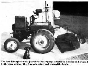 Wilder stripped the combine of everything but the platform, front and rear wheels, engine, transmission, and running gear. He used 2 by 4-in. steel tubing to build a 1 ft. high, 4 ft. long frame that supports the platform, engine, and gas tank. He used 1/8-in. steel plate to build the mower deck and fitted it with three spindles from a worn-out 1950's Deere 3-pt. flail chopper. He mounted two 30-in. and one 28-in. long blade on the spindles. The offset blades are driven by an 8¢-ft. long belt that runs from the spindles to the combine's gearbox. The deck is supported by a pair of cultivator wheels 2 ft. apart in front of the mower and three wheels at the rear. Wilder mows in third gear at 8 mph.