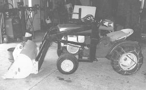 Howard Vogel's 1970's Deere 110 lawn tractor is equipped with a front-end loader that he uses to carry 50-lb. bags of water softener salt, remove snow from his drive-way and haul brush away from his pond. The factory-built loader was originally designed for a small crawler tractor. Vogel's son-in-law started to convert it to use on the Deere tractor but he passed away be-fore he could complete the project. So Vogel finished it himself.