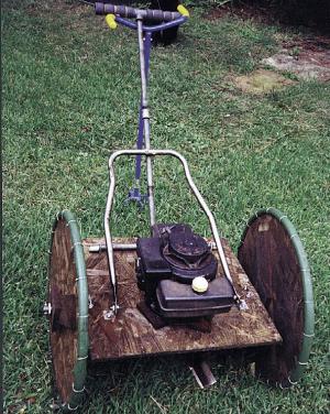 The blades extend 4 in. ahead of the deck to cut brush. I lined the wheels with garden hose, using aluminum wire to tie the hose in place. The handlebar is made from 1/2-in. dia. pipe and has pipe insulation tied onto it for operator comfort. (Daniel Krenzel, 510 Elizabeth St. N.E., Culman, Ala. 35055).
