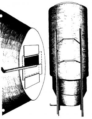 "I've made two of these bins. They stand about 10 ft. high and are just the right size for mixing and storing 1/2 to 1 ton of feed. Also, they don't cost much to build," says Meng. "The bins themselves are 6 ft. high and 48 in. in diameter. I keep the bins in my feed shed and use a grinder-mixer to fill them. I already had the hog waterers. I used the cylinder bars off an old combine to make the steps.