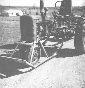 "When you're raking a hayfield with a lot of ground hog or gopher holes that you can't see because of hay cover, you can do a lot of damage to a tractor when a wheel drops into them," says George Sharp, Nicholasville, Kent., who built what he calls a "hole jumper" frame to fit the bottom of his IH Super "C" tractor.