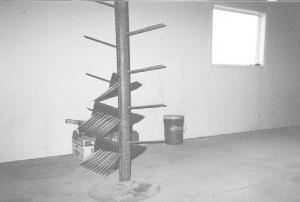 Each 6 1/2-ft. high rack consists of a drill stem pipe welded onto a disc blade that serves as the base. A series of 16-in. long, 3/4-in. dia. rods spaced 1 ft. apart are welded to the sides of the pipe. The shovels simply slip over the rods.