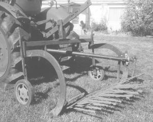 A pair of small rubber wheels that mount ahead of the tines are used to control their depth. Each wheel is connected to a telescoping vertical shaft that's attached to the rig's steel frame. The depth is adjusted by changing the position of a set screw in each shaft.