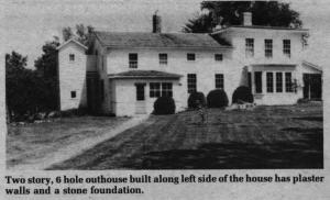 The outhouse is attached to a large house that was originally built without the outhouse in 1871. In 1886, a family with 11 kids ù mostly daughters ù bought the house and added the 2-story privy. The outhouse is constructed from the same materials as the house: stone foundation, lath plaster walls, and glass windows which can be opened. It has 3 seats up, 3 down and a ventilator shaft running from the pit below up to the roof. The upstairs seats are offset so that upstairs "plumbing" can run behind the downstairs seats.