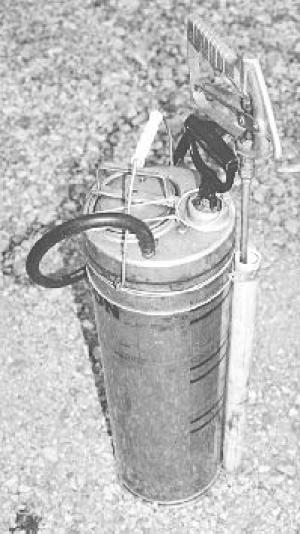 "I also mounted a pail handle on top of a 3-gal. pump-up spray tank and mounted a 1-in. dia. PVC pipe alongside the tank for storing the sprayer wand. I ran a No. 8 wire band around the tank and secured the pail handle to it. I also ran a wire band around the bottom of the tank and used plumber's tape to attach the pipe to the band. The tank was originally designed to be carried by a metal hand loop secured to a circular lid. However, if you accidentally twist the lid as you hold onto the loop the lid can unlock and fall into the tank. To solve the problem I installed a smooth wire lock around the raised base of the pumper to keep the lid loop from accidentally turning. I also made and inserted a filter under and inside the pump-locking device in order to keep weed seeds and small trash, etc., from getting inside the pump tank."