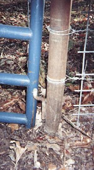 An L-shaped steel bracket welded to the bottom of a gate post keeps the gate from sagging and makes it easy to keep it closed when there are no animals inside the pen. The bottom of the gate post simply slips over the top of the bracket. In addition, the same bracket can be welded to a "T" and driven into the ground to keep gates open and prevent sagging.
