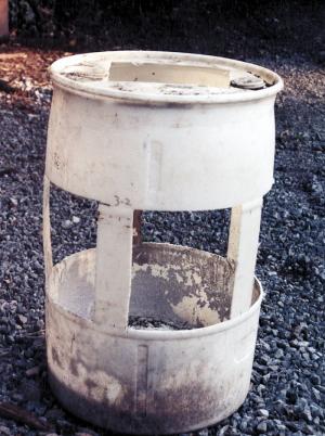 "We've got about a dozen of these feeders on our farm. We buy the 55-gal. barrels for $3 apiece from a friend. Any kind of drum will work as long as it's round and at least 3 ft. in diameter. We made our first barrel feeder out of an old water pressure tank, and we even made one for baby pigs out of a 20-gal. garbage can. We use everything from old garbage can lids to corrugated metal roofing to cover the feeders."