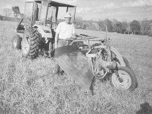 Gannon made the tray out of a 4 by 12 sheet of galvanized sheet metal. He mounted it in a frame he made of 1 1/2 in. square steel tubing. It takes four bolts and about 15 minutes to attach the frame solidly to angle iron brackets mounted on the rake frame.