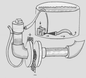 To make the system work, electrical current is passed through the water by attaching a car battery to the electrodes using jumper cables. The current passing through the water produces a chemical reaction that releases small amounts of chlorine gas and ozone. Both gases rise into one end of the U-shaped pipe. A 12-volt DC fish tank aeration pump (the kind used to keep air and water circulating in bait tanks on fishing boats) pulls the gases out of the enclosed PVC pipe to the bottom of the tank of water being treated.