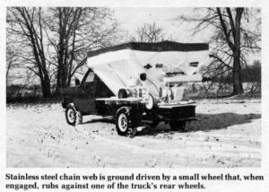 Material is spread in a 45-ft. pattern by two rear spinners, also geared to the truck's ground speed, and run off a pto shaft extended out of the truck's transfer box. Spreading width varies with ground speed. At the best speed for spreading - about 10 to 15 mph - the spreader will maintain a continuous 45 ft. pattern.