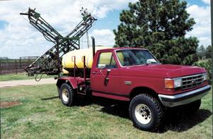 He started with a 1988 Ford F-250 4-WD pickup equipped with a 460 cu. in. engine, 4:10 gear ratio, and 5-speed transmission. A pto-driven hydraulic pump is used to operate the sprayer pump and also to raise and lower the boom and to fold it. The sprayer's 60-ft. long, "X-fold" boom, which Sowers bought new, is fitted with 5-way Tee Jet nozzles that are regulated by a Tee Jet 844 controller that mounts in the cab.