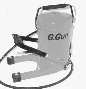 The "G. Gun" is a metal canister that's equipped with a 10-ft. high pressure hose. It holds up to 18 lbs. of grease. The bottom of the unit is equipped with a self-priming pump. A clip-on lid keeps out rain and dust. To grease the zerk you simply step down on a pedal on one side of the canister. The unit can be pumped by hand when used under low machinery.