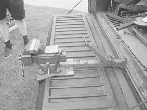 The attachment has an L-shaped steel plate that hooks over the back edge of the tailgate. A 4 1/2-in. Sears vise mounts on top of this plate. The other end of the attachment clamps onto the front edge of the tailgate using a lever that you push down. To remove the attachment, Henderson simply raises the lever to release the clamping pressure on the front edge of the tailgate.