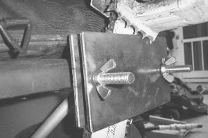 He used a couple pieces of 5 by 7 1/2-in. steel plate, two 1/2-in. bolts 3 in. long with wing nuts to fit, two 5-in. square pieces of adhesive-backed rubber, a 5-in. length of 1 1/4-in. angle iron, another plate measuring 5 by 5-in., and finally two U-bolts that fit over the bar on the cargo rack.