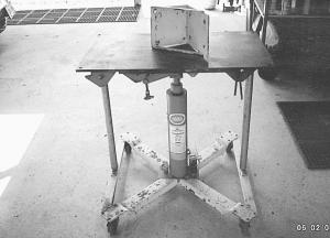 "This hydraulic welding table raises from 35 in. to 7 1/2 ft. high and will lift up to 1,100 lbs. To raise the table all I do is pump a foot pedal. To lower the table, I depress a smaller pedal and the table comes down. The table measures 21 by 36 in. and has a 1/2-in. thick working surface. If ever there was a backsaver, this is it - I'd never part with it. To build a hydraulic welding table like this from scratch I'd charge about $1,200."