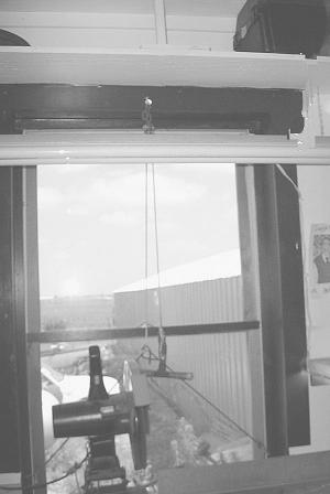 Rope Operated Shop Ventilation System FARM SHOP Handy Hints 28-5-36 Mark Bruellman, Rolfe, Iowa: "Whenever I use the chop saw in my shop, I don't like all the dust and smell it makes. To solve the problem, I placed the chop saw on a workbench in front of a double hung window with a spring in it so it doesn't take much effort to go up and down. I hooked a rope up to the window and ran it over a pulley, so that whenever I grab the rope it automatically pulls the window up and all the dust shoots out the window. It saves having to reach over the back of the workbench to open the window. A long lag bolt is embedded in the window frame, and I simply push it down to shut the window. If I did a lot of cutting, a vacuum system might work better. But for occasional shop use, this idea works fine."
