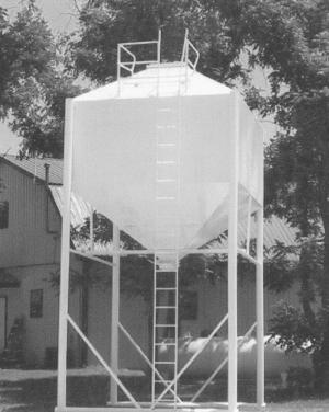 Klepper's bins are made from 12-gauge sheet metal. For stand-alone bins, he sets them solidly on four legs made of 5 1/2- in. pipe. Height of the bin can be adjusted to fit your needs. For bins on legs, he offers an optional ladder and safety walkway.