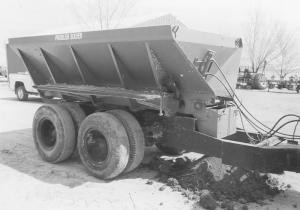 Hoffner made a cart out of an old road sand and salt spreading trailer which he bought from a local state highway maintenance department. The machine, which holds about 10 tons of material, has a 16-in. wide conveyor at the bottom to drop material onto the fan. The sides slope in to the conveyor, so it empties out completely.