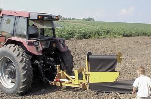 The 3-pt. mounted machine is equipped with a single large shank with a roll of fabric on a horizontal shaft above it. As the point digs down, the fabric is unrolled in the slot and buried about 18 in. deep with 18 in. left above ground.
