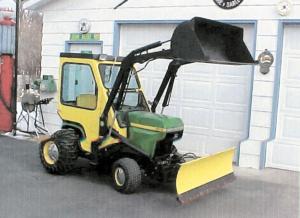 I don't know if this will be of help to anyone else but it sure helps me. I have a Deere 400 lawn tractor with a front-end loader. The problem was that I couldn't put any other front-mount equipment on it when the bucket was on. To solve the problem, I made up a set of extension brackets that moves the mounting point for any front-mount equipment out about 6 in. so the loader can stay in place. All I had to do after the brackets were in place was to make up new hydraulic hoses to reach the couplers. Otherwise, it's easy to hook up the snow blade or snowblower. I just raise the bucket up out of the way, or take the bucket off the lower arms for better visibility. (Arnie Amrhein, 13717 Excelsior Blvd., Minnetonka, Minn. 55345 ph 952 938-8682; email: mnjdnut@aol.com)