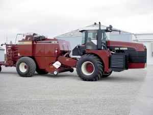 Smoother ride which allows for faster baling. With the tractor's big 30.5 by 32 wheels, the ride is exceptionally smooth, even in rough fields, they say. That allows driving at speeds up to 15 mph in the field, depending on baling requirements. "The sooner you get hay or straw out of the field, the less likely it will get rained on which results in more productivity," says Tom. "This unit travels across bumpy fields so well the driver hardly even feels it. The tractor's 3-speed hydrostatic transmission makes it easy to vary the speed. In first gear we can go up to 6 1/2 mph; in second gear up to 15 1/2 mph; and in third gear up to 21 mph all by operating just one lever."