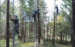 Once the mast is in place, the operator climbs up a few steps and into the seat. He attaches his safety harness with safety lines (supplied with the device) and toe clips and begins to pedal upwards. At the halfway point, he attaches a second set of straps to secure the mast to the tree before continuing the ascent, removing branches along the way.