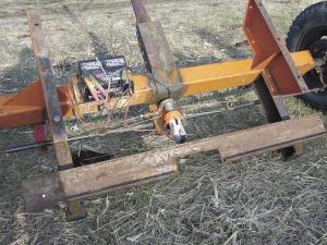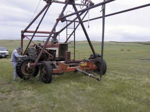 To support each tower as he towed it, he made a saddle out of channel iron that fits on top of a 2-ton front truck axle. A battery-operated winch, with its cable tied to a steering rod at each end of the truck axle, was used to steer the irrigator around corners. Skretteberg sat on the truck axle and operated the winch, while another person drove the pickup.