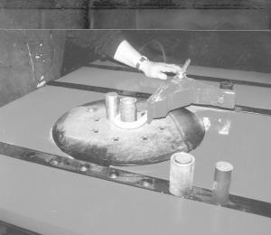 A salvaged hydraulic orbit motor chain-drives the differential which came off a Datsun pickup. Its gears were welded together solid. Above the differential is a final drive from a Deere 95 combine. It's fitted with a large steel pin that rotates in the center of a turntable that was cut from 2-in. steel plate. The piece of metal to be bent is inserted between two adjustable pins in the turntable and rested against an angled steel block. The motor is then activated until the metal is bent to the correct angle.