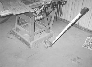 Table Saw On Wheels FARM SHOP Tools 27-1-38 Steve Devaney, Merkel, Texas: "I cut the caster wheels and handle off an old hydraulic floor jack that didn't work any more and use them to move my table saw around my shop. Two wheels and their adjoining support brackets are permanently bolted to a square wooden base that's bolted to the bottom part of the table saw's legs. A small steel ring is bolted to the front side of the base.