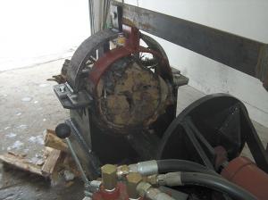 The wedge uses two different sized splitting rings, one located just ahead of the other. The first ring splits the log into four pieces, and the second ring splits it into 12 more pieces. A round steel plate, operated by a large hydraulic cylinder, pushes the log through both rings.