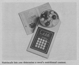 About the size of a hand-held calculator, the Nutriscale plugs into an 110 outlet. Sells for $120.