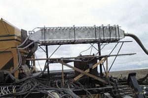 Exhaust is routed from the muffler to a 14-ft. long, 2 by 2-ft. cooling chamber behind the tractor. The air seeder's fan forces it down through the same hoses that deliver seed and fertilizer to the ground. "A big challenge is figuring out how to sufficiently cool that exhaust," he says. "The exhaust comes off the tractor at about 1,000 degrees, and we have to get it down to about 150 degrees so it won't melt hoses and pipes.