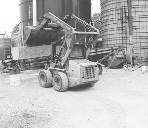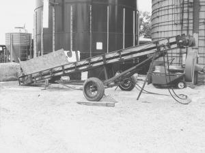 The elevator faces backward and its bottom "drive" end is raised just enough to unload silage into the blower. Its drive chain is operated by an orbit motor. The same tractor that operates the silo blower is also used to operate the orbit motor. A valve is used to control the motor's speed.